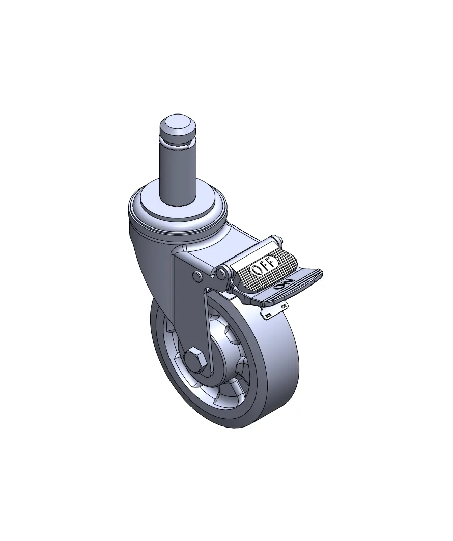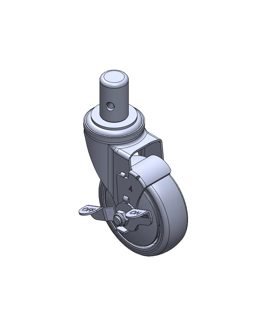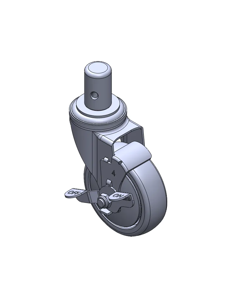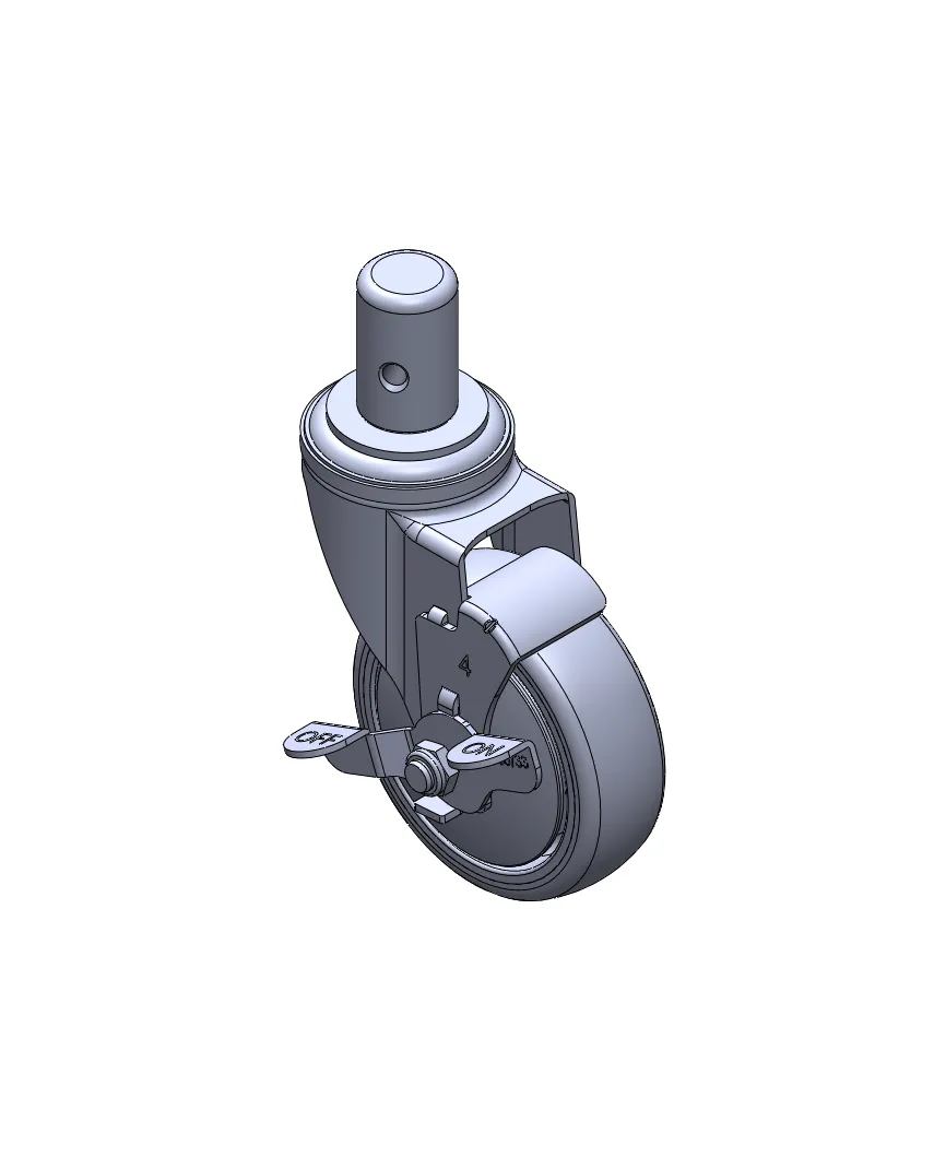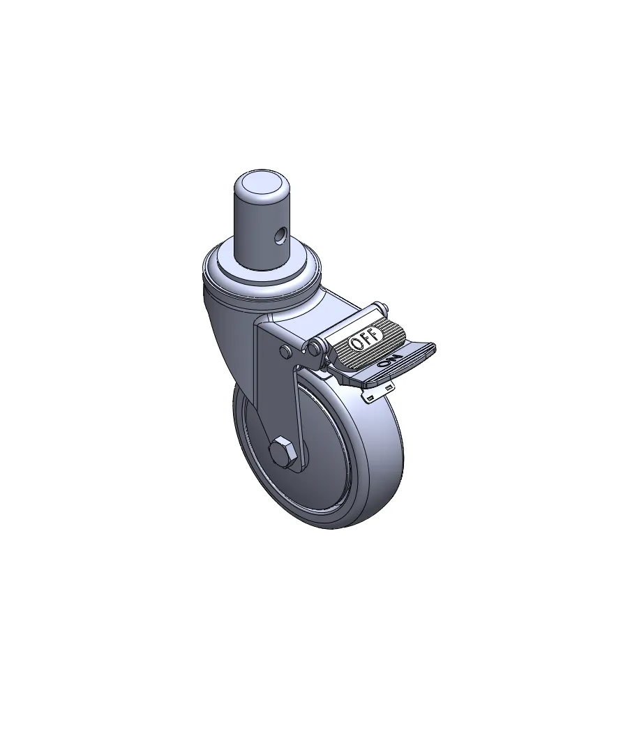 配有側(輪)煞式,鎖定係統的腳輪。插心鉚合沖壓腳架— Ø28x45L 表面鍍鋅,插心式安裝裝置 耐衝擊聚丙烯輪芯,熱塑性彈性體(TPR)輪面 深灰色,輪子—中管式。