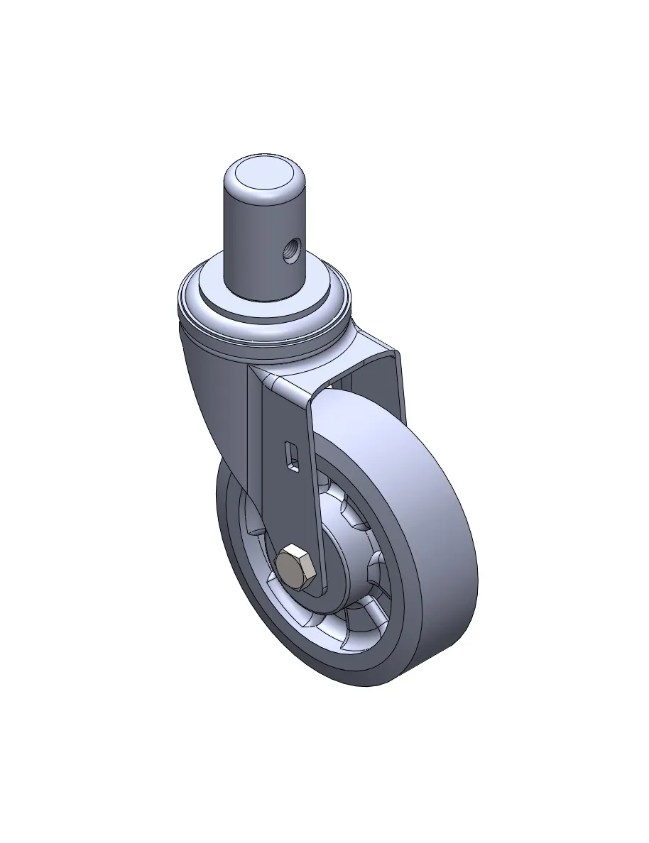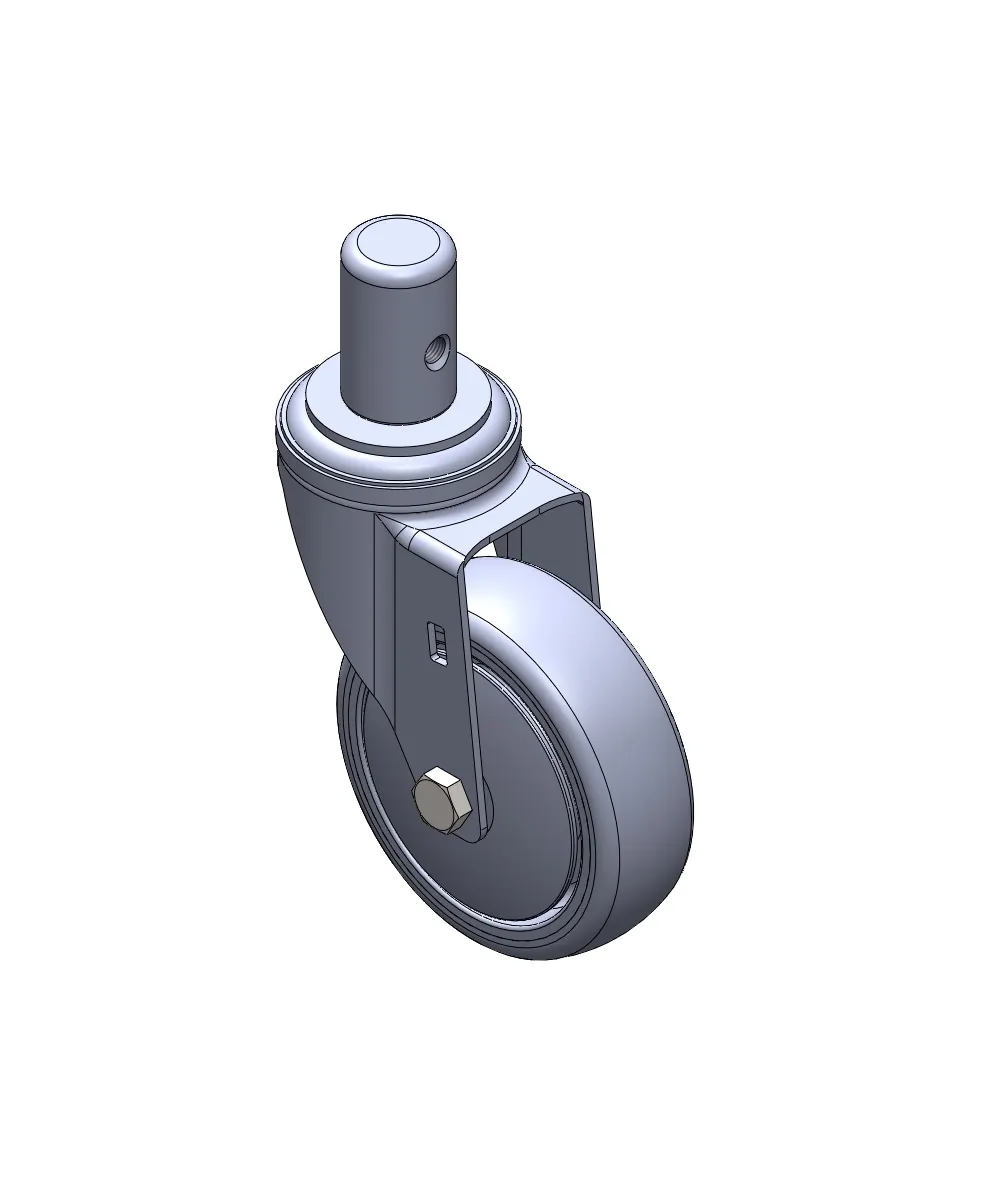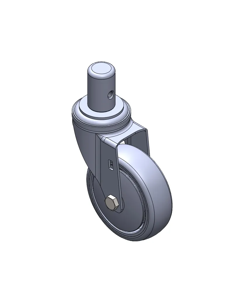 活動式腳輪,插心鉚合沖壓腳架—Ø28x45L 表面鍍鋅,插心式安裝裝置,M8孔 加強式耐衝擊聚丙烯輪芯,熱塑性彈性體(TPR)輪面 深灰色,輪子軸承—精密滾珠。