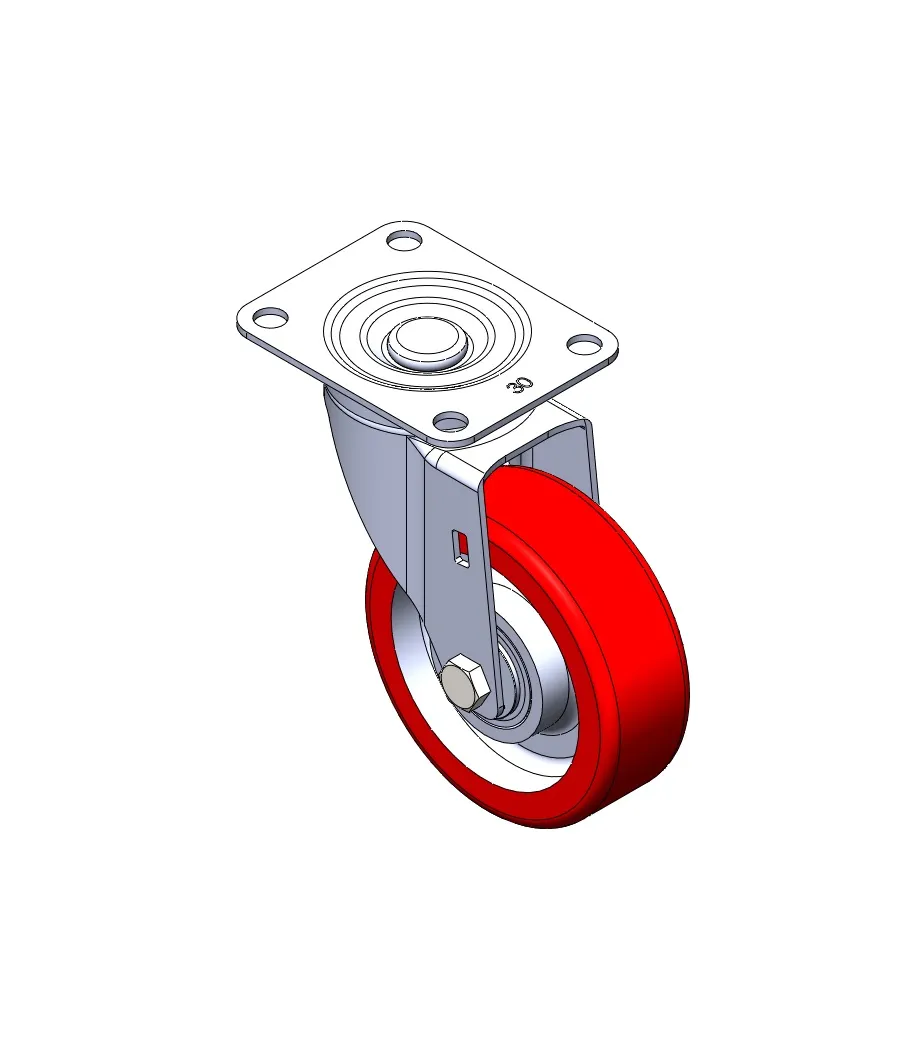 活動式腳輪,底板鉚合沖壓腳架—儀器孔 表面鍍鋅,底板式安裝裝置 鑄鐵製輪芯,高品質聚氨酯輪面 銑紅色,輪子軸承—精密滾珠。