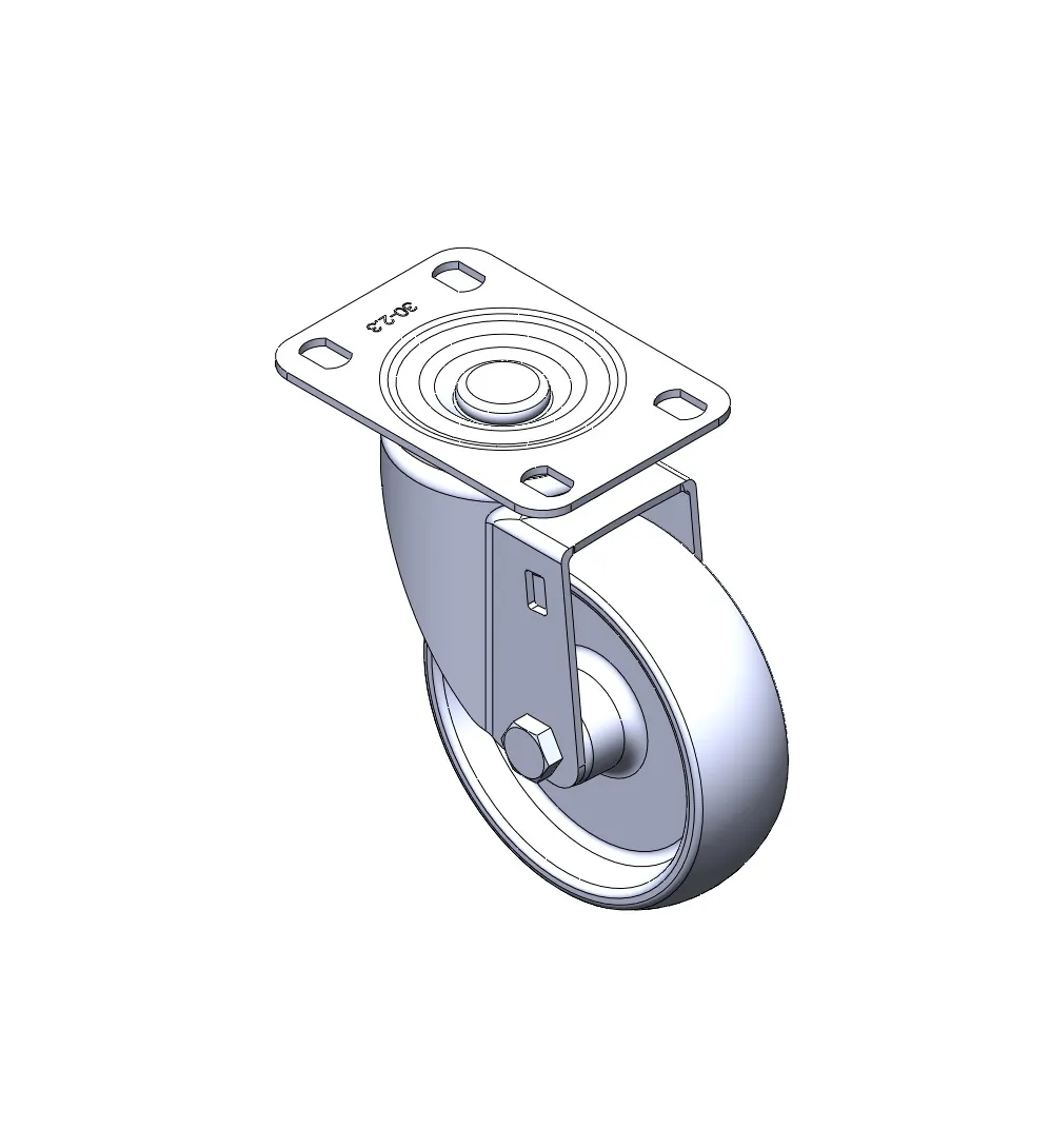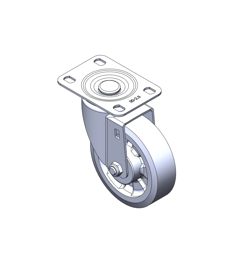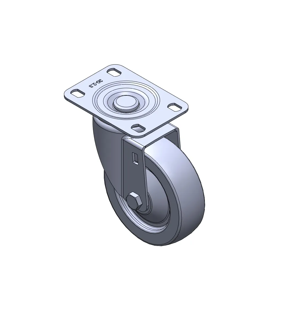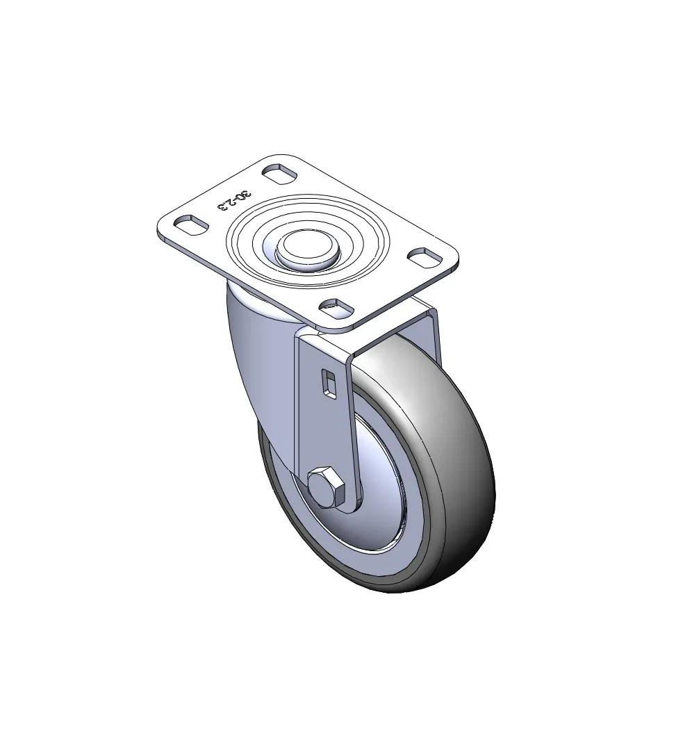 活動式腳輪,底板鉚合沖壓腳架—高級孔 表面鍍鋅,底板式安裝裝置 耐衝擊聚丙烯輪芯,熱塑性彈性體(TPR)輪面 深灰色,輪子軸承—精密滾珠。