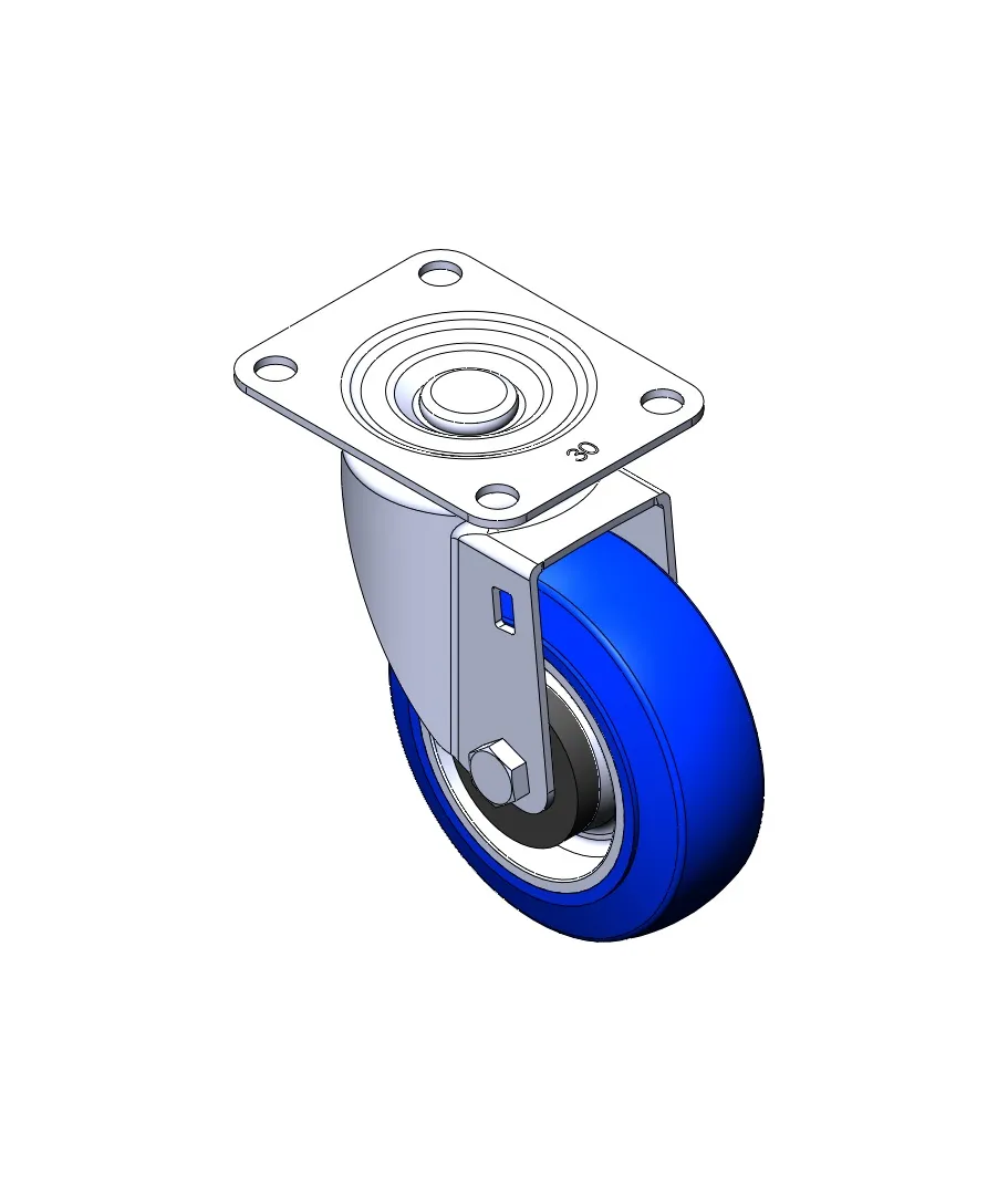 活動式腳輪,底板鉚合沖壓腳架—儀器孔 表面鍍鋅,底板式安裝裝置 耐衝擊聚丙烯輪芯,熱塑性彈性體(TPR)輪面 藍色,輪子軸承—精密滾珠。