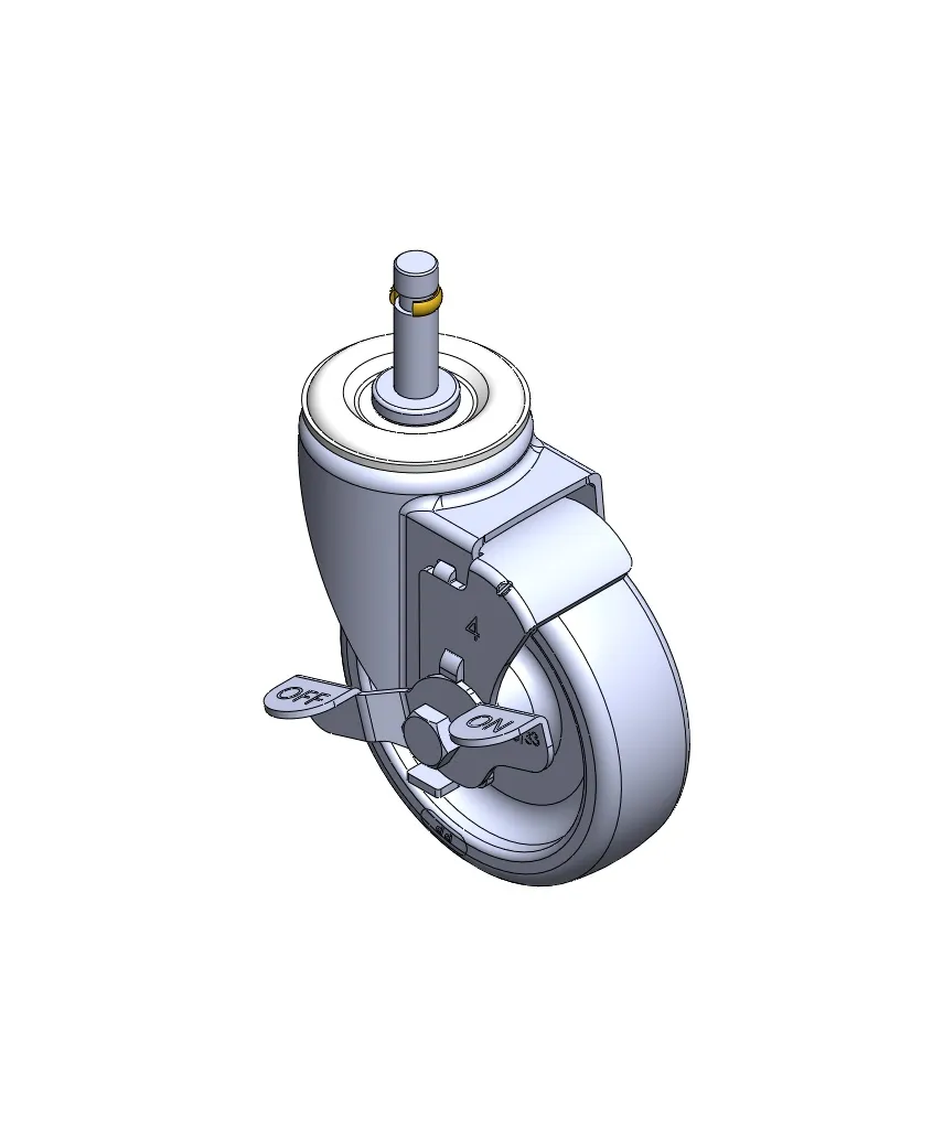 配有側(輪)煞式,鎖定系統的腳輪。插心鉚合沖壓腳架— Ø11x38L 表面電鍍,插心式安裝裝置,(抗UV),附銅扣 聚丙烯輪芯、輪面 黑色,輪子—中管式。
