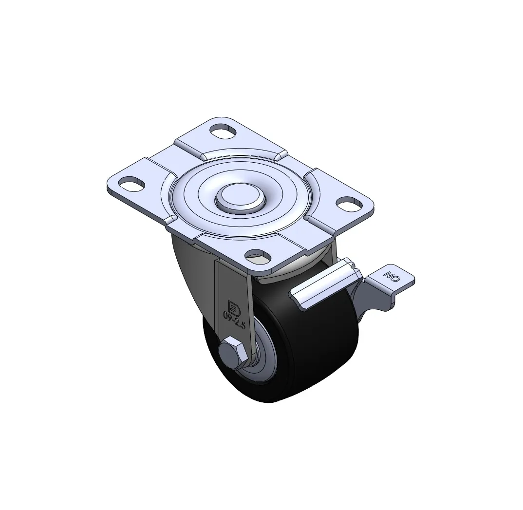 配有側(輪)煞式,鎖定係統的腳輪。底板鉚合沖壓腳架—高級孔 表面鍍鋅,底板式安裝裝置 熱可塑性塑膠輪芯、輪面 輪子軸承—精密滾珠。