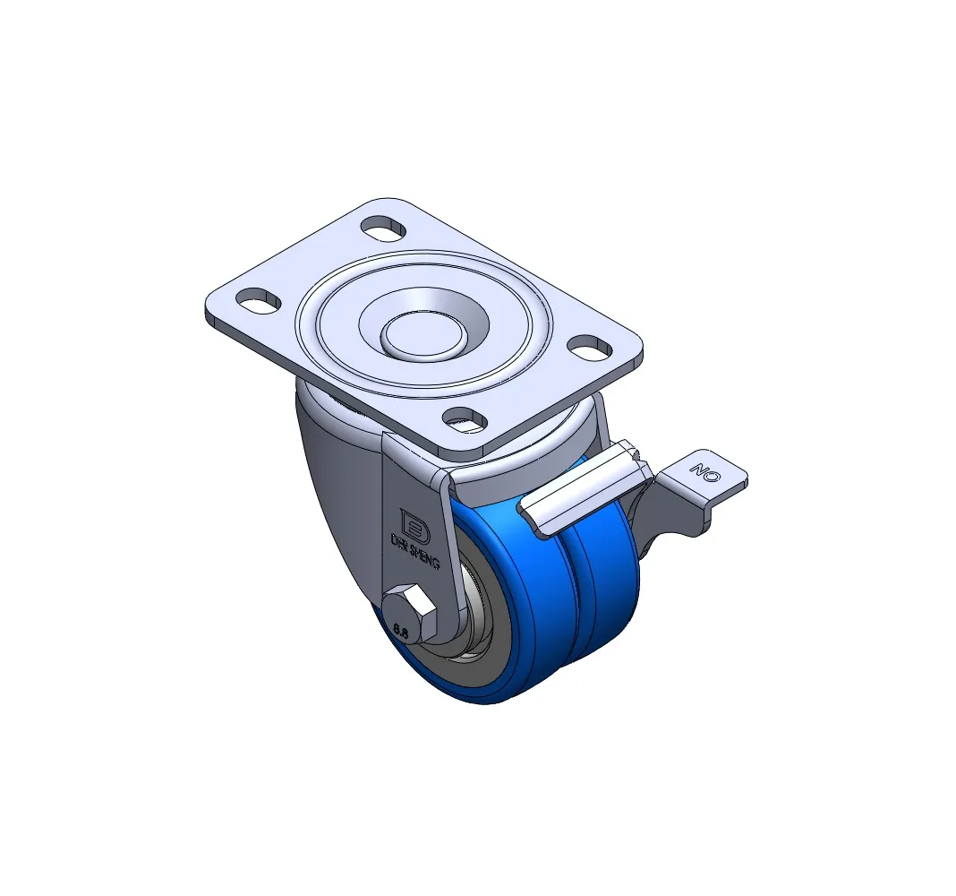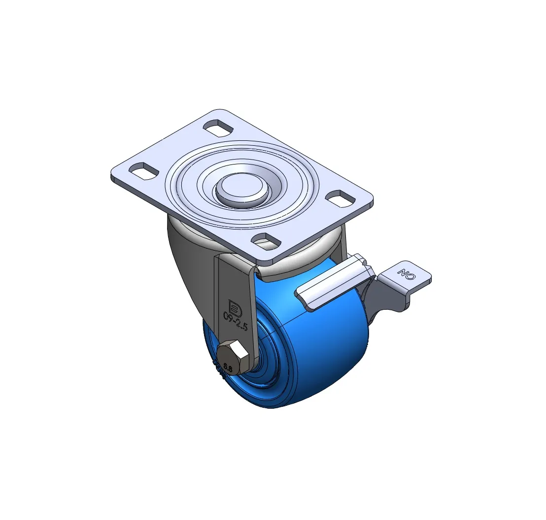 配有側(輪)煞式,鎖定係統的腳輪。底板鉚合沖壓腳架—高級孔 表面鍍鋅,底板式安裝裝置 鑄鐵製輪芯,高品質聚氨酯輪面 藍色,輪子軸承—精密滾珠