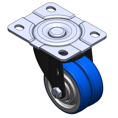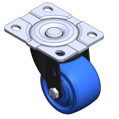 活動式腳輪,底板鉚合沖壓腳架 底板鍍鋅,腳架電著,底板式安裝裝置 鑄鐵製輪芯,高品質聚氨酯輪面 藍色,輪子軸承—精密滾珠。