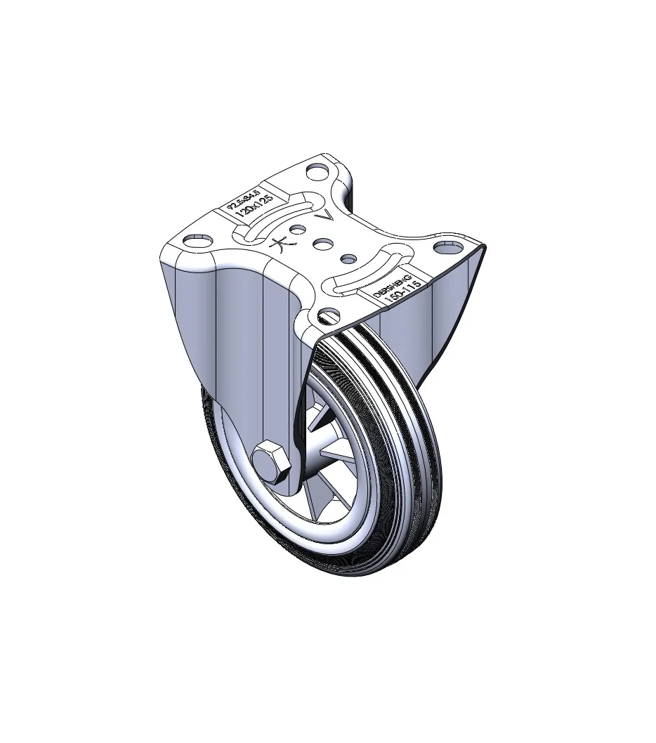 固定式腳輪,一體成型沖壓腳架 表面鍍鋅,底板式安裝裝置 耐衝擊聚丙烯輪芯,熱塑性彈性體(TPR)輪面 深灰色,輪子軸承—精密滾珠。