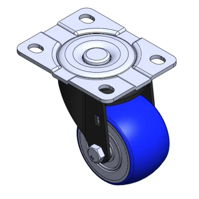 活動式腳輪,底板鉚合沖壓腳架 底板鍍鋅,腳架電著,底板式安裝裝置 鑄鐵製輪芯,高品質聚氨酯輪面 藍色,輪子軸承—精密滾珠。