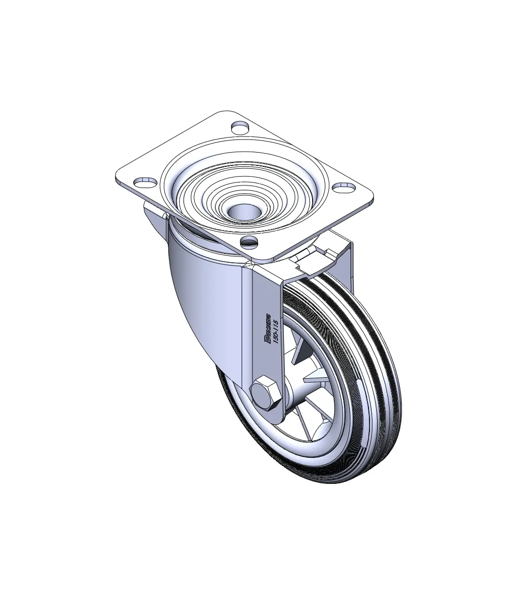活動式腳輪,底板鉚合沖壓腳架 表面鍍鋅,底板式安裝裝置 鑄鐵製輪芯,高品質聚氨酯輪面 褐色,輪子軸承—精密滾珠