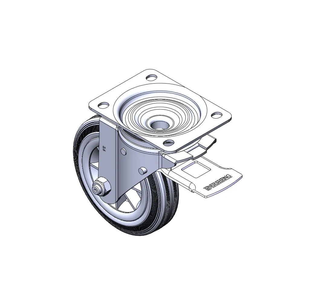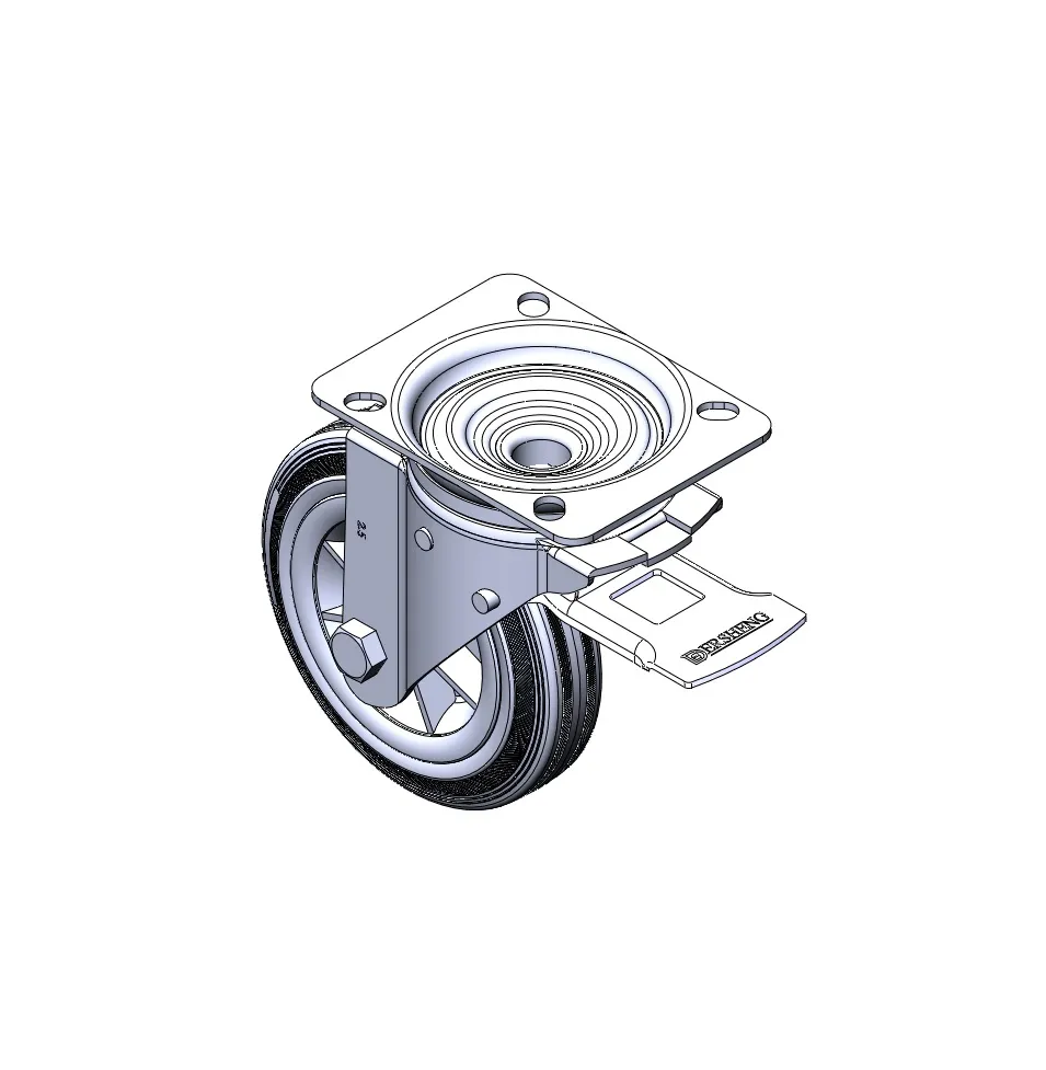配有後煞式,鎖定係統的腳輪。底板鉚合沖壓腳架 表面鍍鋅,底板式安裝裝置 加強式耐衝擊聚丙烯輪芯,熱塑性彈性體(TPR)輪面 深灰色,輪子軸承—精密滾珠。