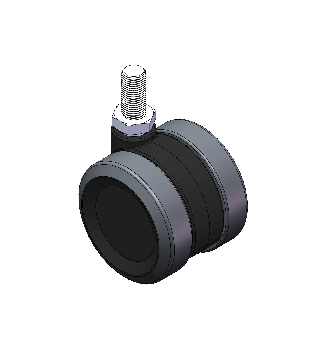 活動式腳輪,牙心鉚合注塑輪架—M12-P1.75 聚丙烯增強料輪架,絲扣式安裝裝置 聚丙烯(PP)輪芯,聚氯乙烯(PVC)輪面 黑深灰色,輪子—中管式。