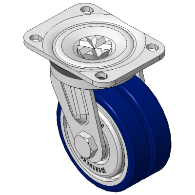 活動式彈簧加載腳輪,焊接鋼板架 表面鍍鋅,底板式安裝裝置,孔距42.5x42.5 鑄鐵製輪芯,高品質聚氨酯輪面,銑藍色 輪子軸承—特徵的精密滾珠,降低運轉阻力 ZQPU雙輪,符合人體工學,更容啟動及轉動