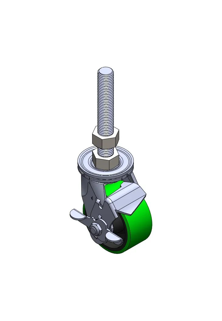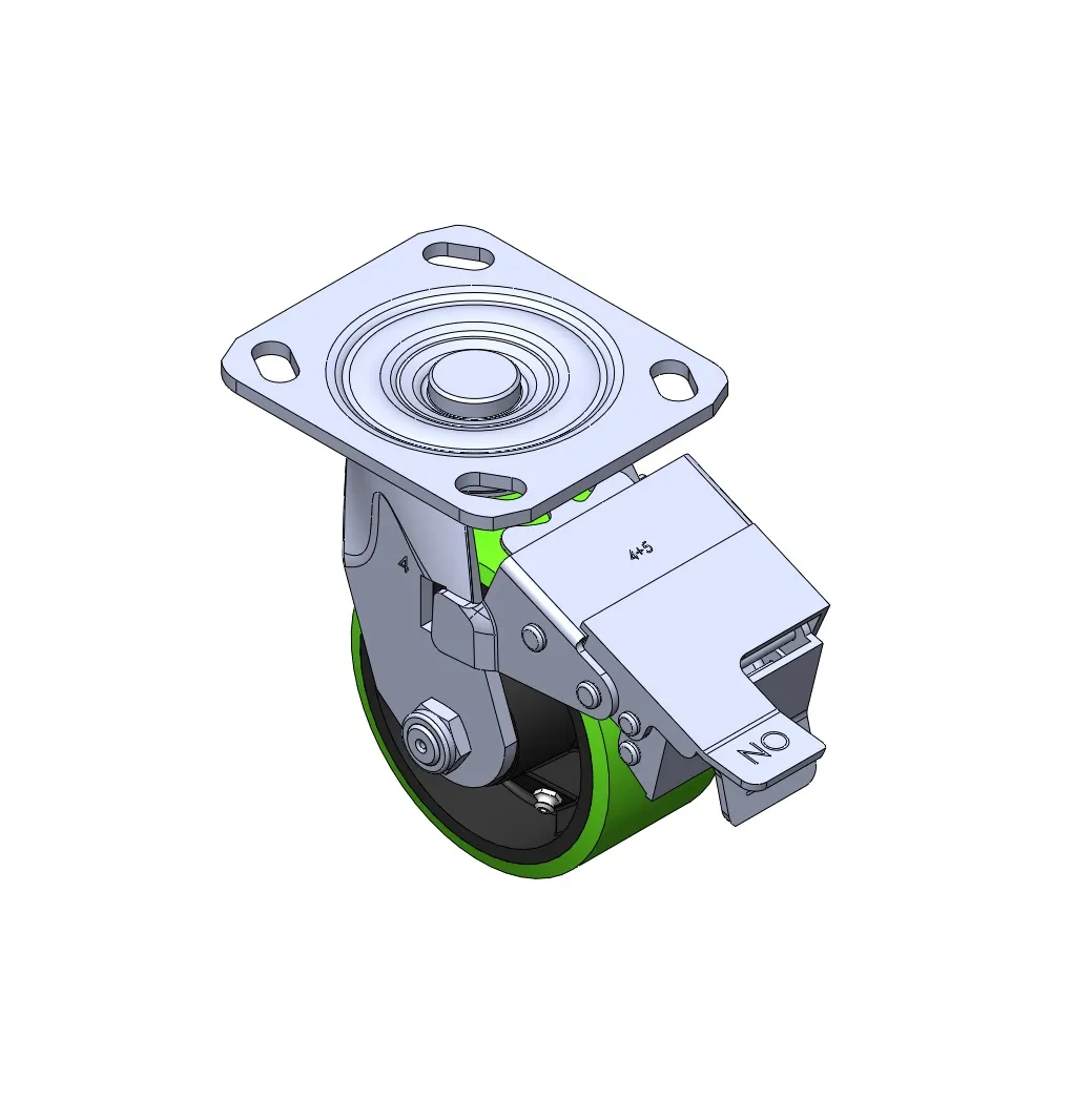 配有側(輪)煞式,鎖定系統的腳輪。牙心鉚合焊接鋼板架— M24 表面鍍鋅,底板式安裝裝置 鑄鐵輪芯、高品質聚氨酯輪面 綠色,輪子軸承—精密長珠。