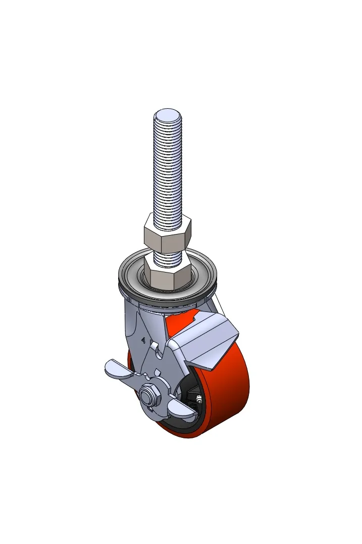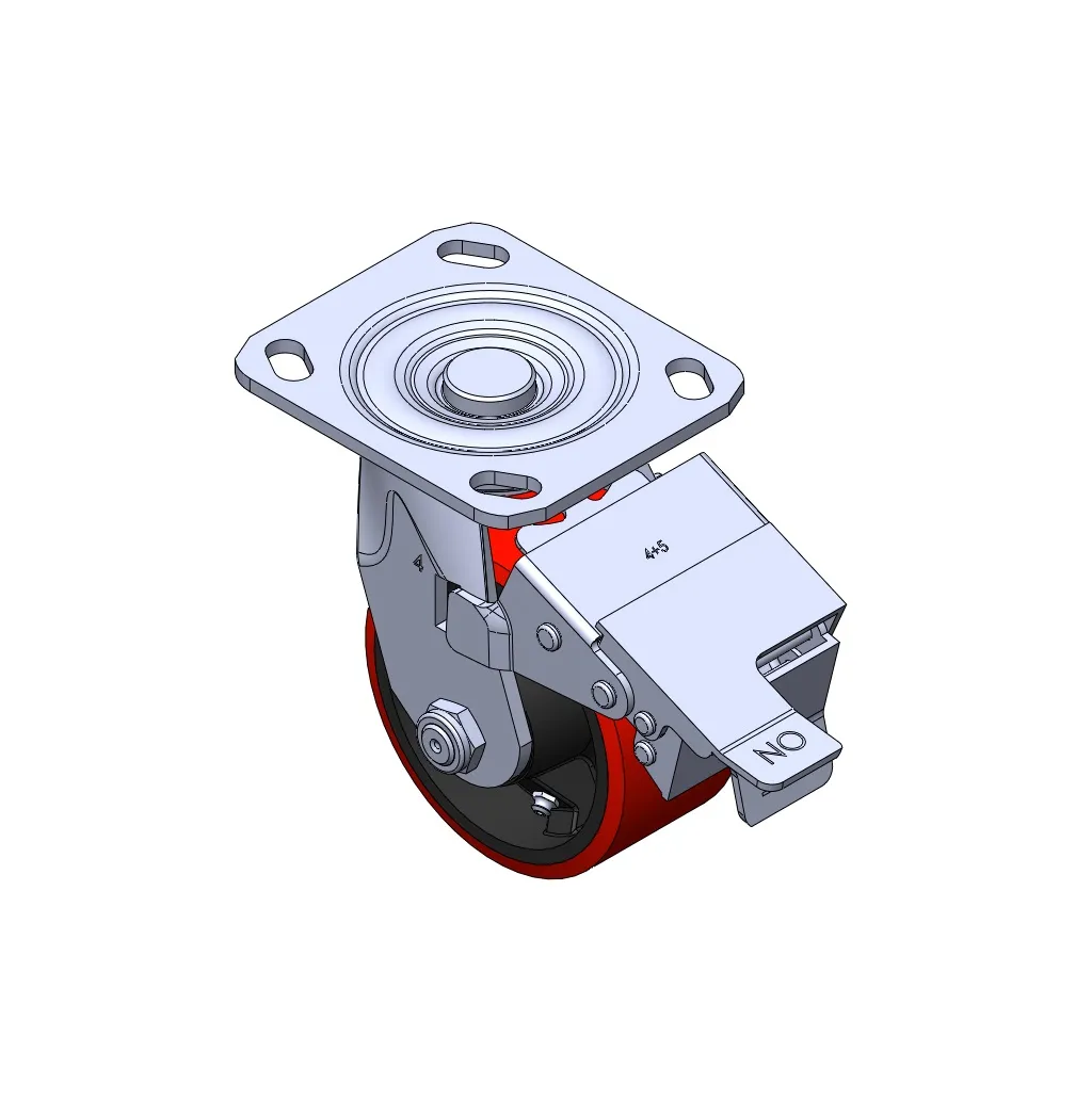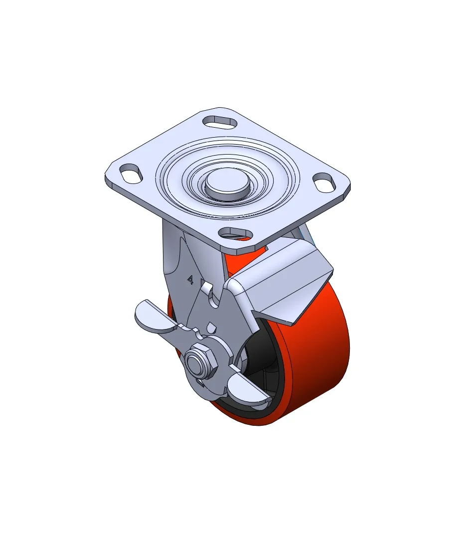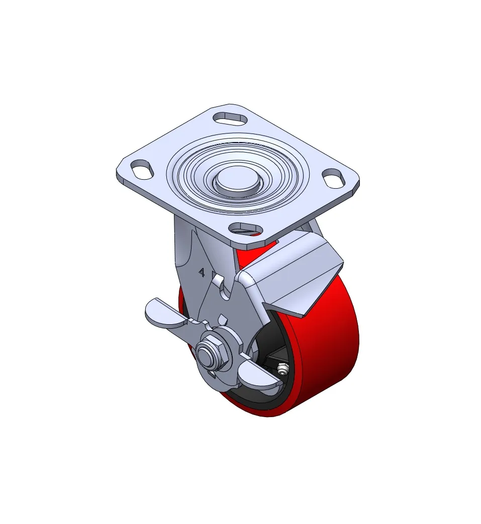 配有側(輪)煞式,鎖定系統的腳輪。牙心鉚合焊接鋼板架— M24 表面鍍鋅,底板式安裝裝置 鑄鐵輪芯、高品質聚氨酯輪面 紅色,輪子軸承—精密長珠。